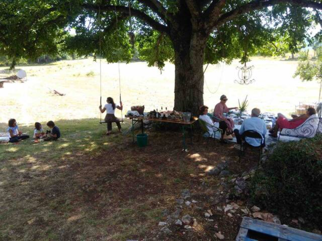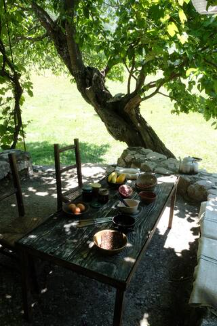 Large 30m² Double Room with private terrace, outdoor dining area, and shared bathroom, providing comfort, relaxation, and peaceful atmosphere.